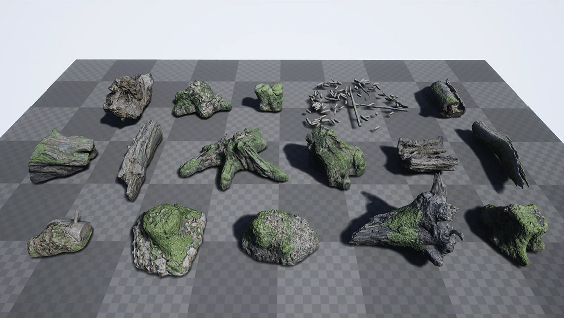 The RealiScan Stumps package contains16 high-quality photoscanned tree stumps and remains.